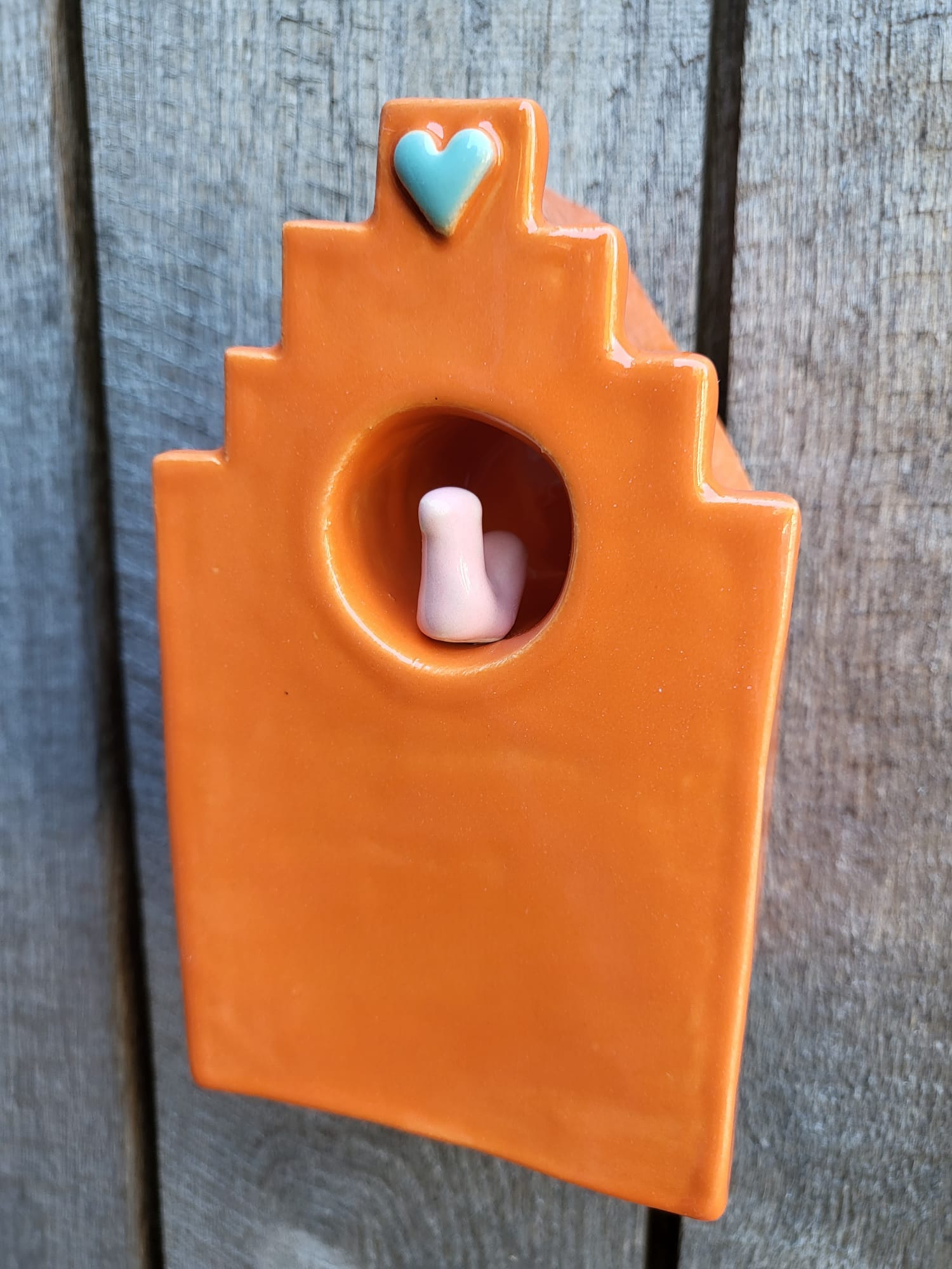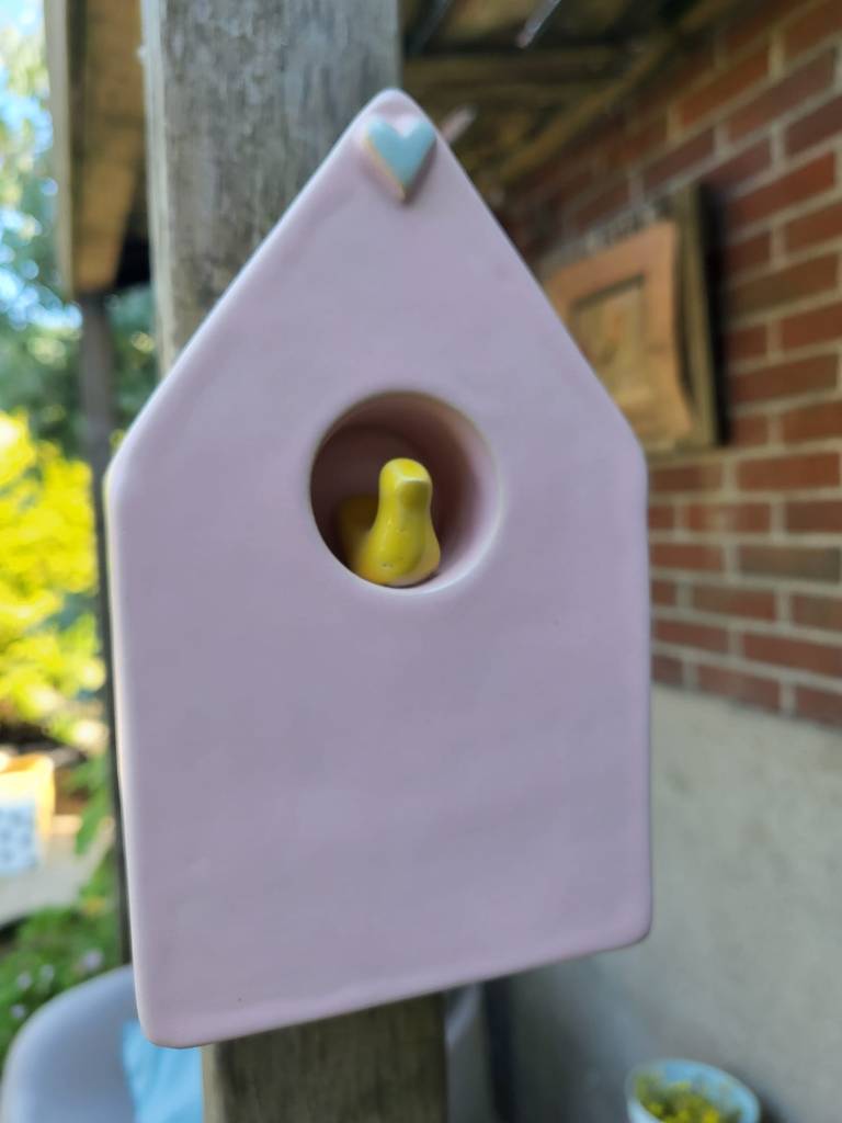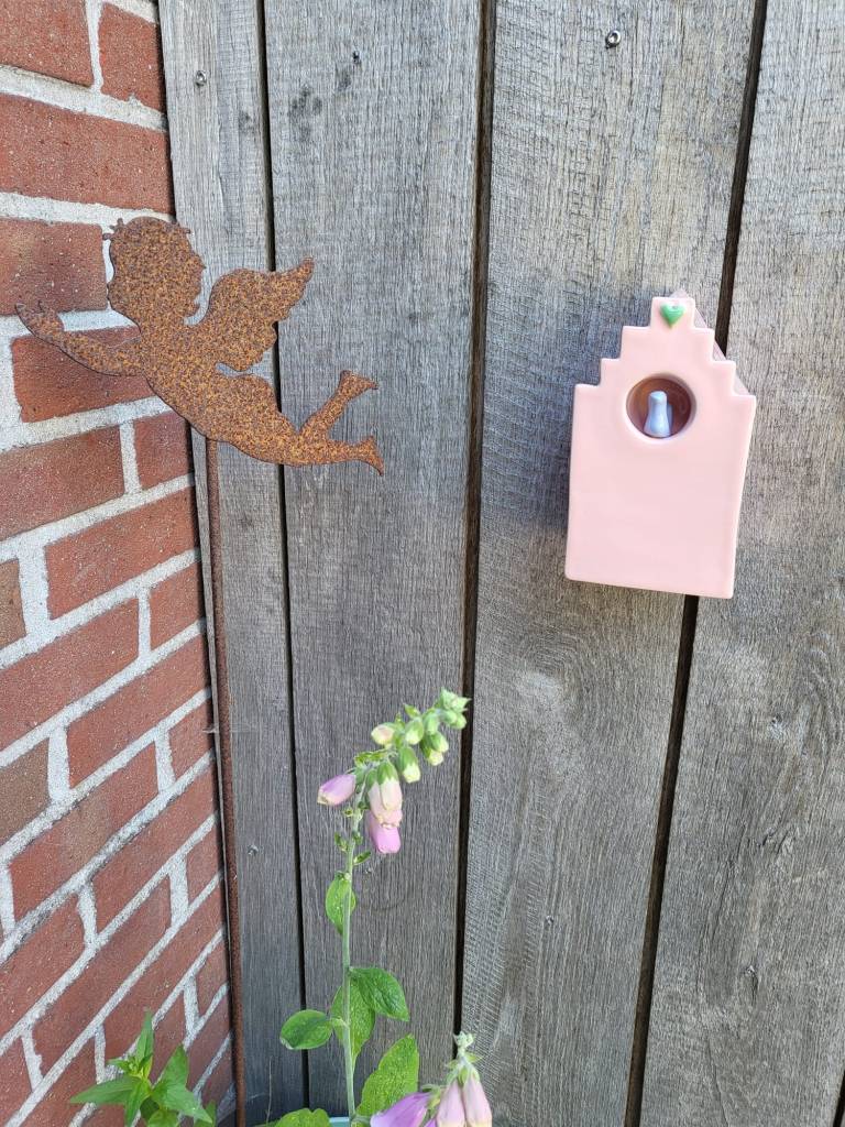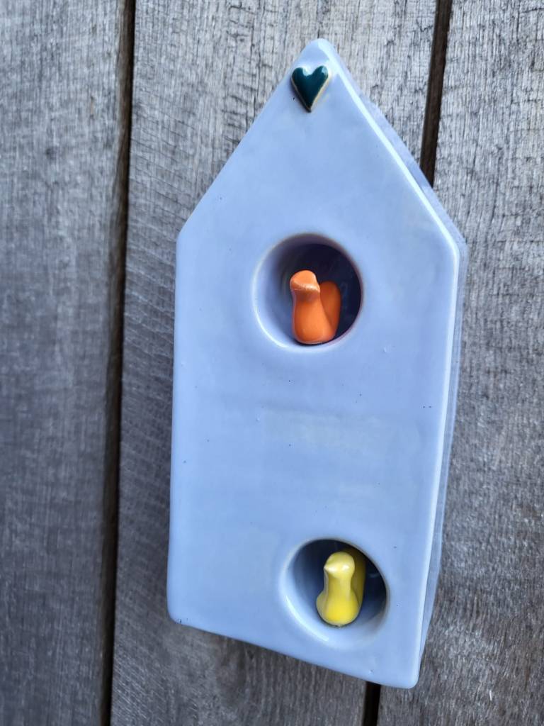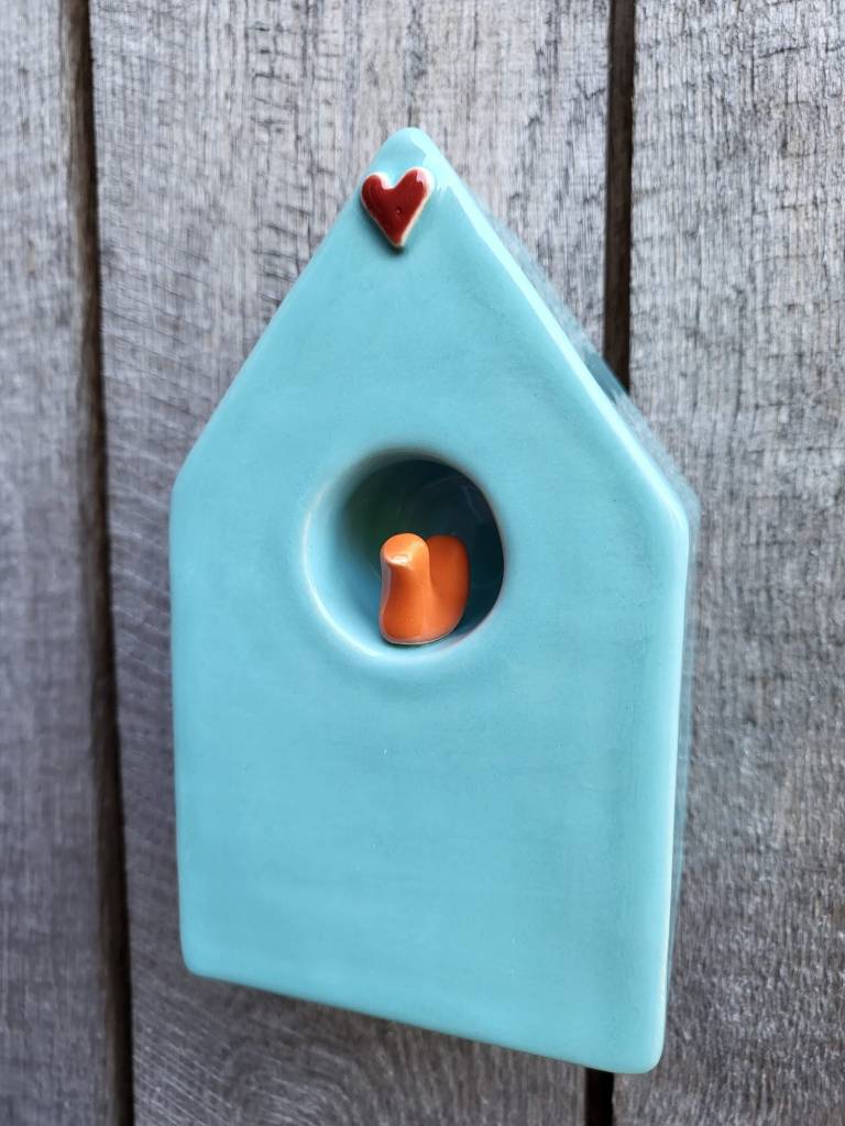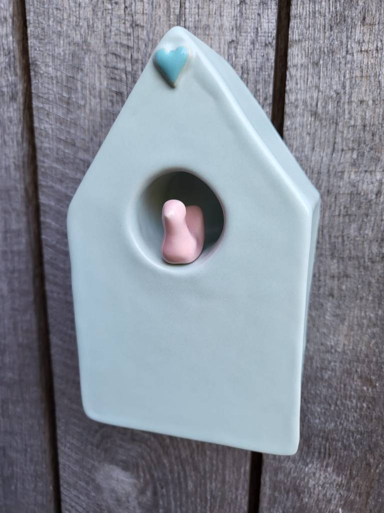 Verkrijgbaar in tafel model of muur model. Muur model kan zowel opgehangen worden als neergezet worden, er is een ophang gat aan de achterkant van het huisje.